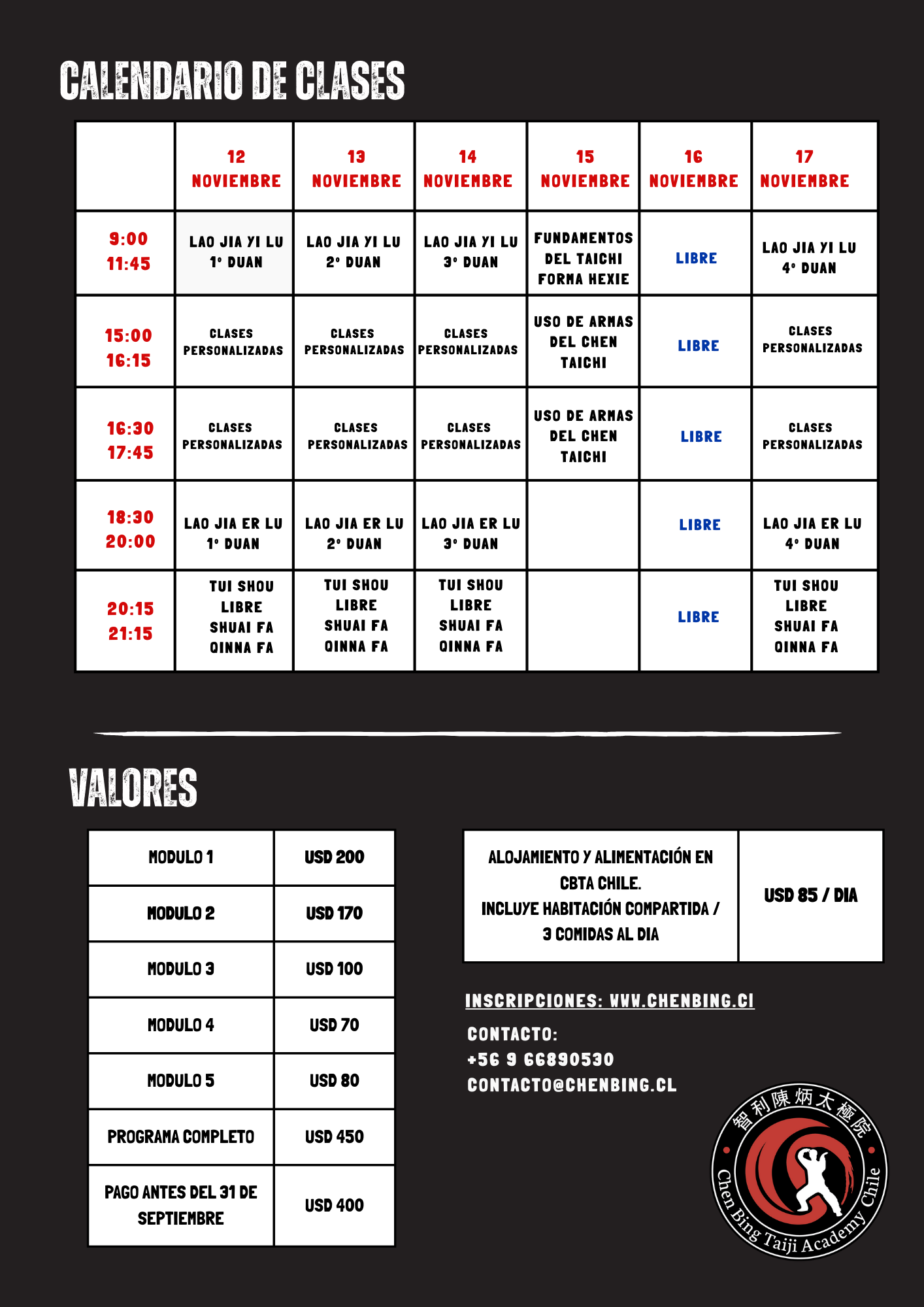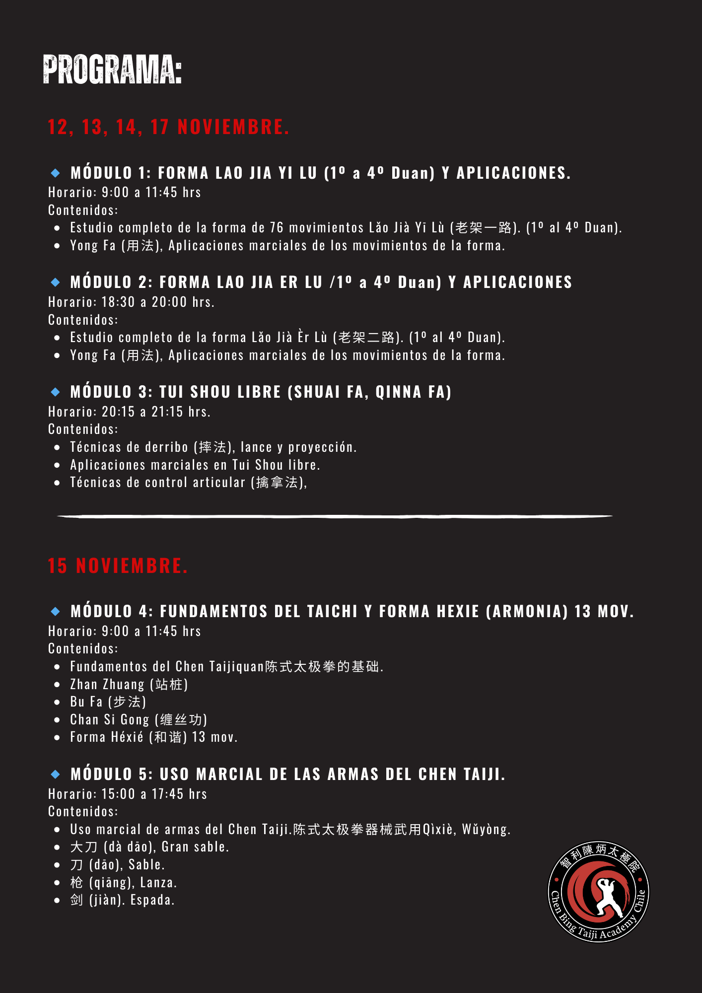 Vive una experiencia única de entrenamiento intensivo durante 5 días, con clases teóricas y prácticas, en jornadas de mañana y tarde. Un espacio para profundizar en los principios del movimiento consciente, la energía interna y la aplicación marcialdel Taijiquan.